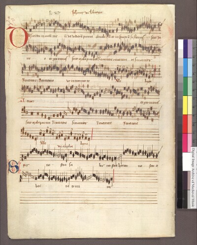 General NoteSee f.254v for concordances and other information; and see note to O felix (f.341). Uniquely here, the Martini number lacks the preceding ‘N.’ and may be in another hand. Copying StyleNo coloration. Extra (9th) stave. Layoutparts Item BibliographyCox, Bobby Wayne. 1977. The Motets of MS Bologna, Civico Museo Bibliografico Musicale, Q 15. North Texas State University, Ph.D. dissertation. Pages: Edition: (2), 255-269. Adler, Guido (editor). 1894-1970. Denkmäler der Tonkunst in Österreich. Graz and Vienna. Pages: Edition: (76), 9-11. Günther, Ursula (editor). 1965. The Motets of the Manuscripts Chantilly, musée condé, 564 (olim 1047) and Modena, Biblioteca estense, a. M. 5, 24 (olim lat. 568). Corpus mensurabilis musicae, vol. 39. Neuhausen nr. Stuttgart: American Institute of Musicology. Pages: Edition: 49-52. Schrade, Leo (editor). 1956-. Polyphonic Music of the Fourteenth Century. 24 vols. Monaco. Pages: Edition: (5), 172-177. |