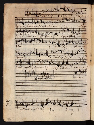 General Notethis copy has the fullest text of the 3 versions, indeed the only text for the upper voices: "Ce povre mendiant pour Dieu / n’a benefice ni office, / qui ne luy vault ou soit propice / autant que porte sur le lieu.". The London version only has 'Pauper sum ego' (in all voices); the Basevi 'text' for the upper voices is only an incipit and completely different. |