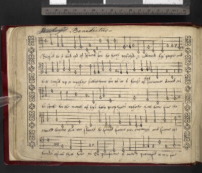 4 paper partbooks (D-iii + i + 26 + i folios, A-iii + 26 + i, T-iii + i + 26 + i, B-iii + i + 28 + i), 140 x 201. Several parchment fragments from a (13th-14th century?) chant manuscript pasted on flyleaves at beginning of each book. Original ink foliation in each book, 1-17, crossed out and replaced with new pencil foliation, 1-17, beginning one folio before ink foliation. Nine unnumbered folios at end of D, A, T books, and 11 unnumbered folios at end of B book have blank staves only; f. 1 in each book and f. 14 in DB books also have blank staves only. Original covers lost; books rebound in mid 16th century in brown leather covers, with English royal arms and voice designations tooled in gold. Some modern restoration of bindings.