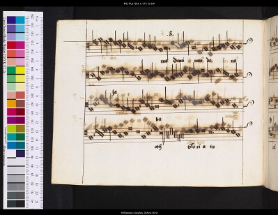 Original ink foliation in each book, 1-17, crossed out and replaced with new pencil foliation, 1-17, beginning one folio before ink foliation. Nine unnumbered folios at end of D, A, T books, and 11 unnumbered folios at end of B book have blank staves only