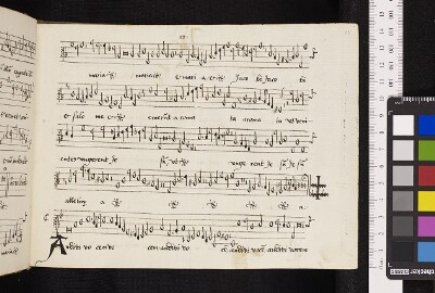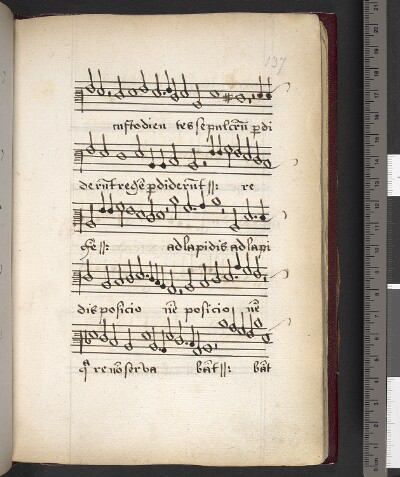 General NoteNotes: chant notation with ligatures; several different sections, divided by barlines, with only beginnings of texts entered; |