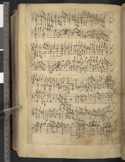General NoteAnnotations/Corrections: five lines (C1, C3, C4, C4, F4), ascribed to 'cantus / controalto / Tenor / [not asccribed / bassus'; first half of penultimate line crossed out; Notes: Ronda' in front of all lines; |