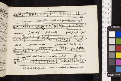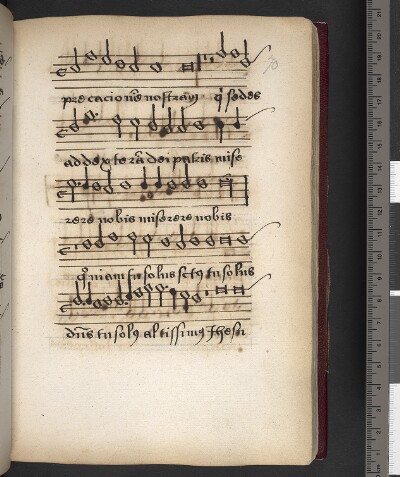 General NoteAnnotations/Corrections: some corr. on f. 6v and 7, incl. lines lines clarifying which syllable belongs to which note; at end cipher as seen in vol. 74; in outer margin of f. 7, in different ink, 'John kyge'; | |||