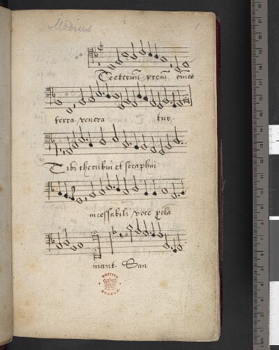 General NoteAnnotations/Corrections: some corr. on f. 6v and 7, incl. lines lines clarifying which syllable belongs to which note; at end cipher as seen in vol. 74; in outer margin of f. 7, in different ink, 'John kyge'; |