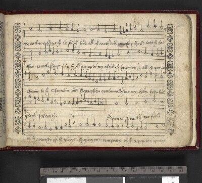 General NoteAnnotations/Corrections: At top of first line in different ink some crossed out annotations, then 'John [...]'; similarly some unreadable annotations in bottom margin of f. 2; in forth and fifth lines of f. 2, in two consecutive bars entered '8. tymes,' into stave, under notes (also the same, erased in previous bar); in penultimate bar (f. 3v) '5 tymes' written in stave under first two notes; text corr. in second line f. 2v; Notes: incl. 'O our father w[hi]ch art in heauen' on f. 2v (pointed out with big initial words), with text corr. of 'fulfilled' to 'done'; |