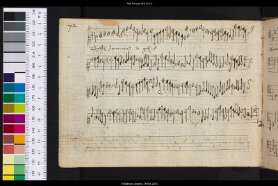 General NoteNotes: fragment of score of four parts, with another empty stave at bottom of folio (thus on top of the score); only about a third of the folio survives (beginning of the lines missing); |