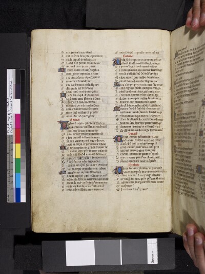 RISM B/IV 2: A 14th century parchment manuscript in two volumes meas. 355 x 260 mm. Pn 22545 contains 200 folios plus 3 unnumbered paper flyleaves at the front and 2 at the back. The paper leaves belong to the 18th century binding of red morocco, which has gilt tooling and title on the spine. There is no old foliation, but a probably 18th century ink foliation appears at t.r.r. The writing is mainly in 2 columns with many illuminated miniatures and blue-red or red-blue initials. The notation is of Ars Nova type on red five-line staves. Pn 22546 contains 164 folios plus the same number of paper flyleaves as Pn 22545. The binding too is the same as for Pn 22545. This most complete source of the musical works of Guillaume de Machaut, and the two volumes contain only Machaut's works, musical and non-musical, at one time belonged to the Paris Carmelite convent, where it still was at the time the Abbé Lebeuf wrote his description of the ms in 1746. Later it entered the library of J. Gaignat (1697-1768) and then of the Duc de la Valliere, where it bore the signature 25. Finally it was deposited in the Bibliothèque Nationale after the duke's death in 1780. All the music except items 1-3 is in codex Pn 22546, again in 2 columns with the exception of the lays, which as usual are in continuous lines across the page. There are 11 staves per page; red notes are infrequent. The polyphonic compositions in Pn 22545-22546 amount to 2 lays, 23 motets, 40 Ballades, 20 Rondeaux, 8 Virelais, the mass and the hocket. Written accidentals are frequent in this source. Polyphonic works occupy folios 54v-56v; 62v; 93-96; 102v-154; 160-164.