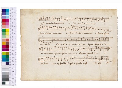 General Noteat end scroll (with composer's name and) 'Gaudete i[n] d[omi]no et exultateiusti.' ConcordancesRowe 316 |