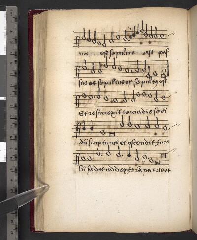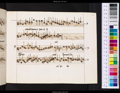 General NoteNotes: text corr. on f. 12v; on f. 12v also markings as to what notes belong to one syllable; on f. 14v, last line has no text; |