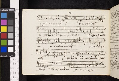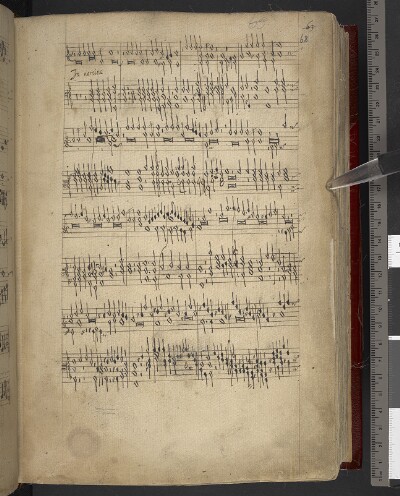 General NoteAnnotations/Corrections: Secunda pars' on f. 63v, last line; in outer margin, before first line of music, a dotted 'X' in different ink (brown-ish), and beginning of 2a pars similarly a '+'; Notes: Time signature changes to cut circle on f. 64, sixth line.; |
