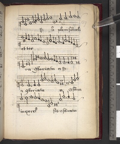 1 paper partbook of an original 6 (Various parts, mostly D and A-i + v + 111 + i folios), 140 x 194. Original ink pagination, 1-189; new pencil pagination, 190-221 (several pages lack numbers, but all included in enumeration except last page). Blank staves only on pp. 32-45, 64-69, 213, 221. Original covers of beige parchment on cardboard, inscribed with voice designation "DISCANTVS" and monogram "TE"; two string ties. Incomplete original index on second and third original flyleaves lists pieces in order of appearance. Copied by several scribes. Staff height 12-13. No initials or decoration. Some pieces have text incipits or titles only.