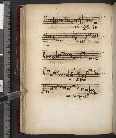 General NoteAnnotations/Corrections: Pen trials at top and bottom of 2r; library stamp on 2v; Notes: Adaptation of Absterge Domine. Handruled staves through this book.; |