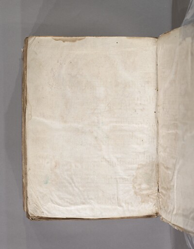 Thin parchment flyleaves from the re-binding of a manuscript written in the twelfth century, probably in England, containing Rufinus, Historia Monachorum, and texts by St Jerome, St Athanasius and others. The flyleaves contain fifteenth-century music on some but apparently not all faces, in void mensural notation that appears to have been washed out, deliberately or by exposure to damp, and has become hard or impossible to read.