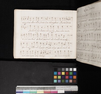 General NoteNotes: elaborate initial 'T' in red and blue; on f. 97r, three staves pre-ruled, but only one and a half used; |