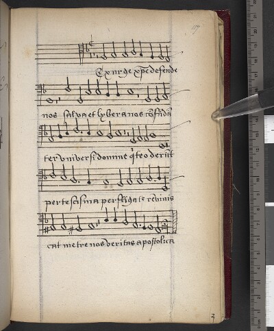 LayoutThis discarded song was copied on f. 65v; a new folio was ten pasted on top to hide it, and "Hodie Christus copied (f. 65*v). The page pasted in had been used previously to notate a version of "Sic Deus dilexit" in quasi-score, which as scrap paper was pasted in upside down. |