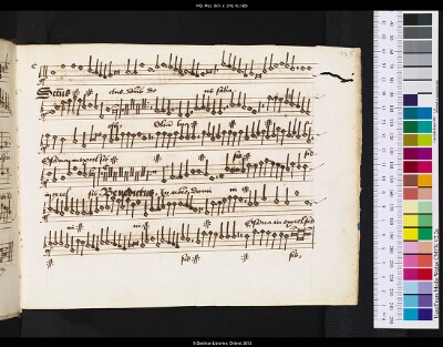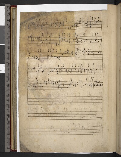 Layoutscore LayoutA page pasted over f. 65v to hide the discarded song "En attendant amour", it had been used previously to notate a version of "Sic Deus dilexit" in quasi-score, which as scrap paper was pasted in upside down. |