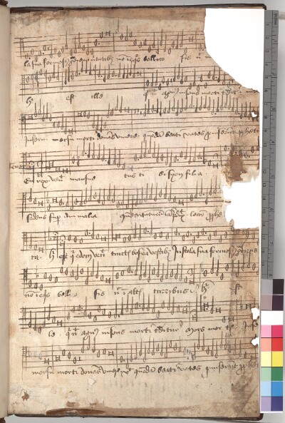 Position on Page'The first recto begins halfway through a contratenor to the verse '[Hic est qui de Edom venit tinctis Bosra vestibus: in sto]la sua formosus..' The tenor is below.' (Magnus Williamson, Jan. 2021). |