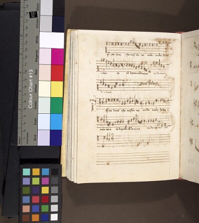 (156v) E-Sco 5-1-43, 106v–(157r) E-Sco 5-1-43, 107r | Benedicta semper = Je ne demande - 2a pars (of 2): [motet text] = O d'estre avec vous | - | |