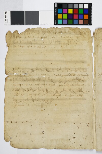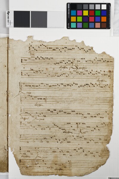 General NoteFRAGMENT CXVe s. 6ff. Papier, 345X255 mm. Foliotation moderne. Les ff. 1, 5v, 6r-v, sont blancs. Notation mesurée blanche. 12 portées par p. dans le ms. primitif, f. l-5v [Missa] 4vx. Gloria, Credo et Sanctus, tous incompl. General Noteevidently 'complete' without the Kyrie or Agnus, as evidenced by blank staves at either end of the fascicle |