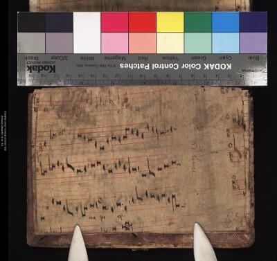 i paper + 153 parchment folios, 180 x 120. New pencil foliation, 1-153; 17th-century pagination of main text. Original covers of red leather (now faded to dirty white) over oak boards; clasp lost. Music on back flyleaves (= new ff. 150-153), apparently the only surviving remnants of a 15th-century choirbook; all four folios originally part of same bifolio. Black mensural notation with black void and red full coloration, except for motet "Sancta Maria," in white mensural notation. Latter piece in score format; other pieces in choirbook format. Copied by six or seven scribes. No initials or decoration.