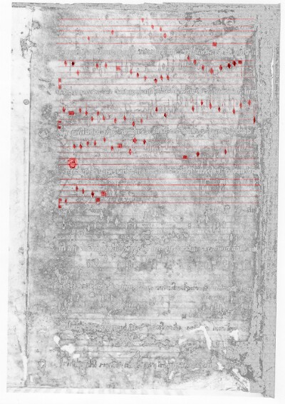 2 parchment folios, ca. 257 x 180 (= 1 bifolio, ca. 257 x 360, trimmed from original size of ca. 257 x 410), now pasted inside back cover of missal. Apparently the only surviving remnants of a liturgical music manuscript. No original foliation visible. Black mensural notation on red staves. Copied by a single scribe. Staff height 16.5. No initials or decoration on music folios; missal has gold-leaf initials and marginal ornaments in French style, with later overlay of Italian decoration, including unidentified coats of arms on f. 1 and f. 145.