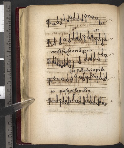 General NoteAnnotations/Corrections: on fols 18v to 20, the beginning of the top stave has been amended in red ink (space seems to have been left out, as for an initial); Notes: initial missing; 2p beginning on fol. 19, not marked; |